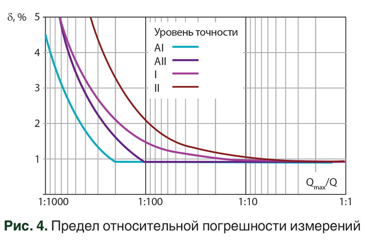 Метрологические характеристики преобразователей обеспечивают возможность их применения в серийно выпускаемых теплосчетчиках 1 класса (табл. 2, рис. 5), полностью отвечающих действующим нормативным требованиям.