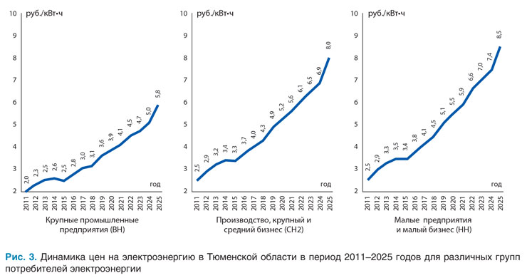 Несмотря на то, что Тюменская область является регионом с относительно дешевой стоимостью природного газа, потребляемого электростанциями, с 2011 года по настоящее время для категории средних и малых промышленных предприятий выявлен значительный рост цен. За период с 2011 по 2025 год прирост цен на электроэнергию составил 229 %. Иными словами, стоимость электроэнергии в Тюменской области за 14 лет выросла в 3,2 раза (с 2,5 до 8 руб./кВт•ч без учета НДС).