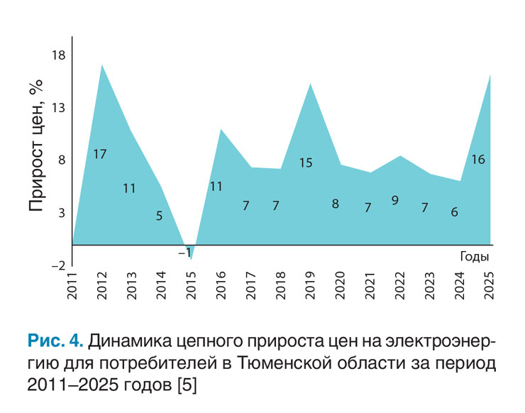 Определены показатели динамики цепного прироста цен на электроэнергию для потребителей в Тюменской области за рассматриваемый период (рис. 4). Показатели ежегодного прироста цен на электроэнергию характеризуются постоянными изменениями. В период с 2020 по 2024 год среднегодовая величина прироста цены на электроэнергию составляла 7 %, при этом в 2025 году прирост составил 16 %. Столь существенная величина прироста в 2025 году говорит о влиянии на цену электрической энергии общего уровня инфляции, а также отражает негативную тенденцию для экономики региона и страны в целом.