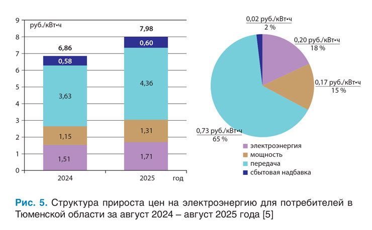 Структура прироста цен на электроэнергию для потребителей в Тюменской области за последний год представлена на рис. 5. Можно видеть, что наиболее значимый вклад в прирост цены вносит составляющая услуги по передаче электроэнергии, которая составила 73 коп./кВт•ч, что добавило 10,6 % к стоимости электрической энергии.
