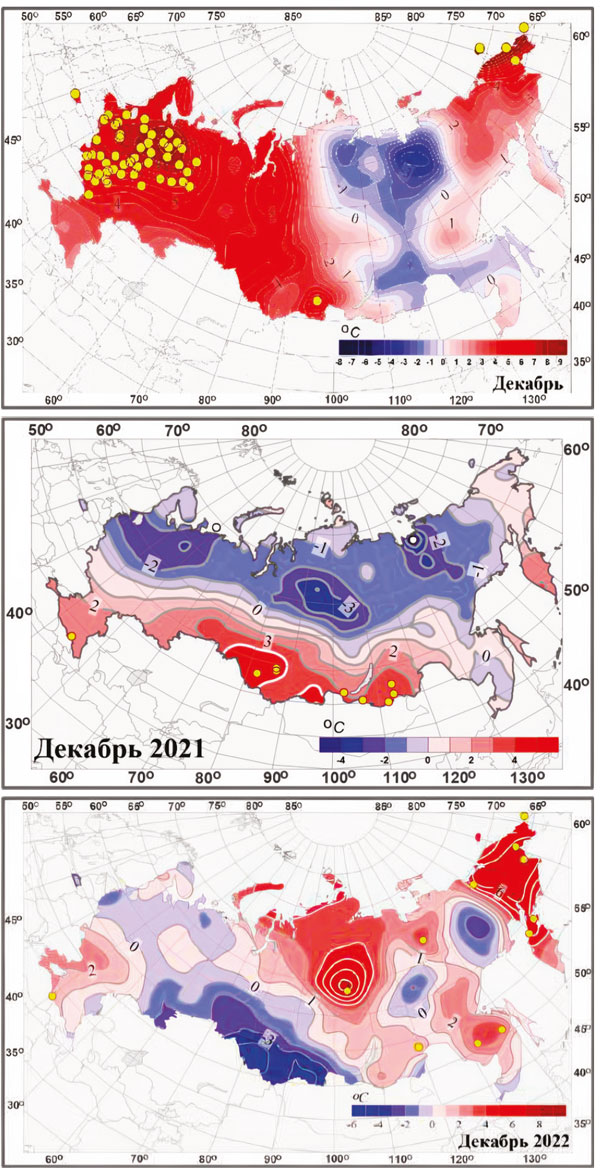 Рис. 2. Аномалии среднемесячной температуры воздуха в декабре 2019, 2021 и 2022 года [1, 3, 4]