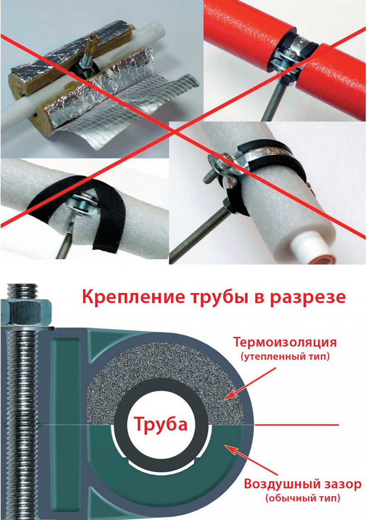 - крепить изолированные плотными полимерами трубы можно непосредственно через изоляцию;