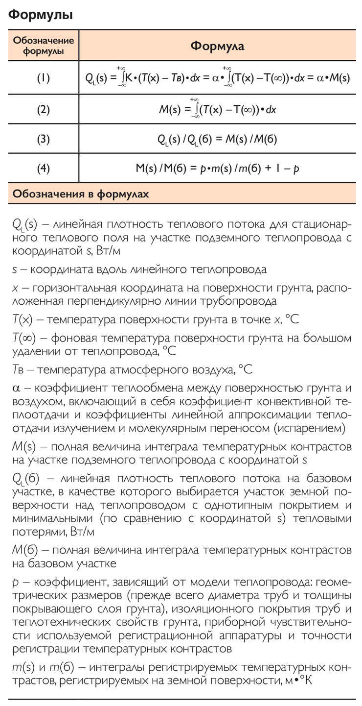 Температурное поле от подземного теплопровода формируется на земной поверхности в результате потерь тепловой энергии. Линейная плотность теплового потока QL(s) для стационарного теплового поля (то есть тепловые потери на участке линейного подземного теплопровода) определяется по формуле (1) (см. Формулы).