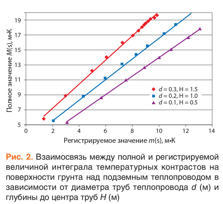 Следовательно, отношение интегралов регистрируемых температурных контрастов m(s)/m(б) может рассматриваться как устойчивая энергетическая характеристика подземного теплопровода и сравниваться для разных сезонов или этапов съемки при оценке динамики развития температурных аномалий. Важно, чтобы температурные контрасты m(s) и m(б) были зарегистрированы при одинаковых метеоусловиях на однотипной земной поверхности.