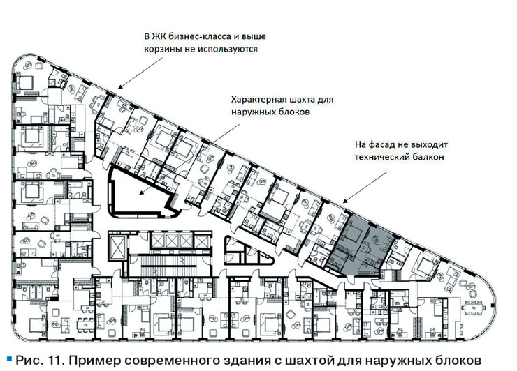 В отличие от обычных технических балконов вариант с шахтой требует от разработчиков проекта более тщательных инженерных расчетов – ведь наружные блоки будут работать в сложных и менее предсказуемых условиях.