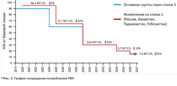 Следует отметить, что Российская Федерация, ратифицировавшая Кигалийскую поправку к Монреальскому протоколу в 2020 году, в соответствии с критериями Монреальского протокола является технически развитой страной и, соответственно, имеет довольно жесткий график сокращения потребления ГФУ.