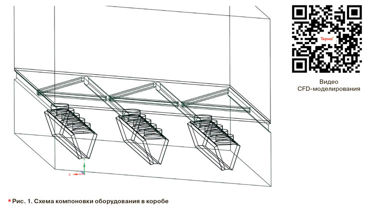 Благодаря повторяемости конструктивных элементов и схемы размещения аппаратов для анализа была выделена характерная ячейка из трех рядом стоящих драйкулеров «Терма». Такой фрагмент отражает все ключевые особенности течения: взаимное влияние соседних аппаратов, обтекание балок и взаимодействие с решеткой. Моделирование полной системы (более 25 аппаратов) не только потребовало бы неоправданных вычислительных ресурсов, но и не добавило бы новой информации – картина течения в каждой тройке повторяется.