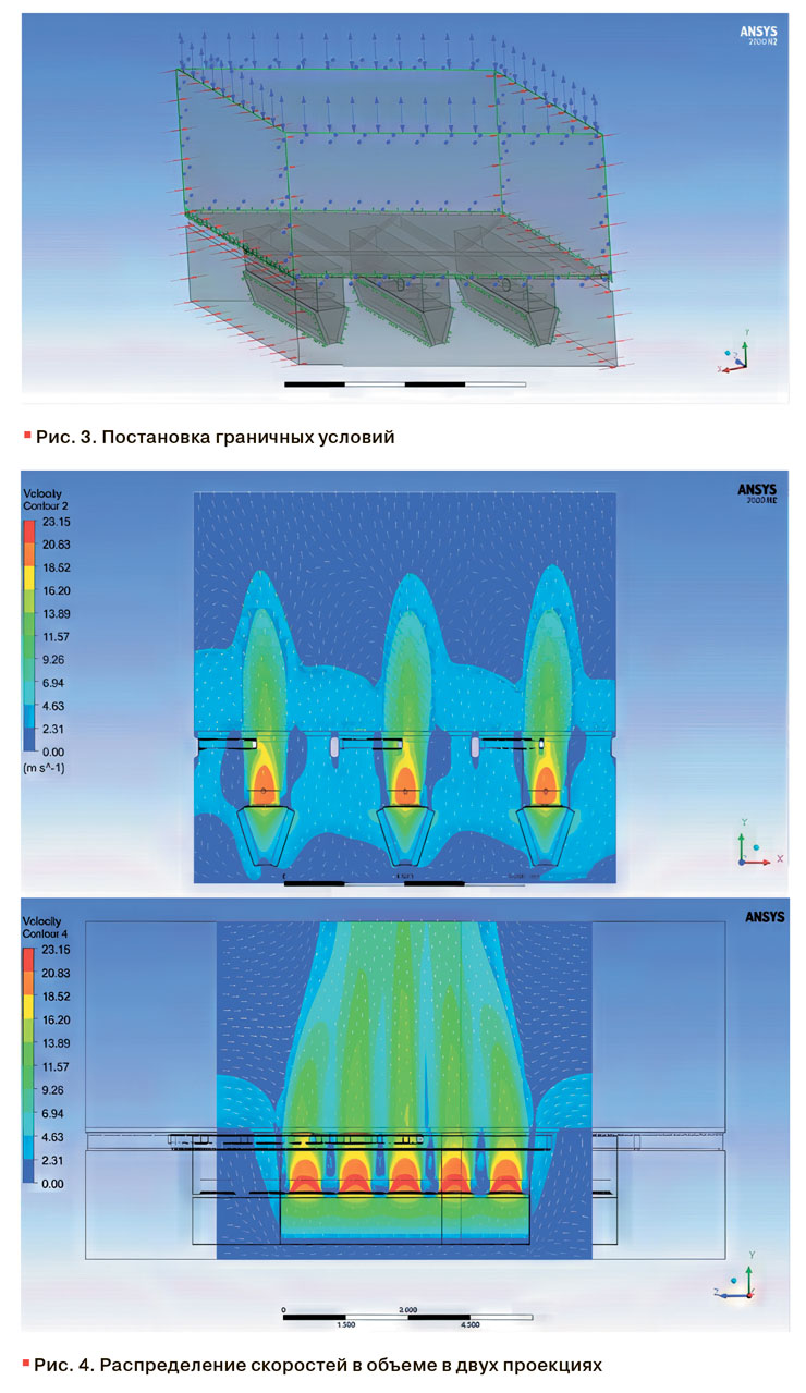 На рис. 4 представлен результат CFD-моделирования, демонстрирующий структуру воздушных потоков. Визуализация позволяет оценить неравномерность поля скоростей, вызванную наличием балок: отчетливо видны зоны завихрений и замедления потока, влияющие на равномерность забора воздуха аппаратами. Хорошо заметен также эффект «слипания» струй – из-за разницы давлений создается разрежение и соседние потоки притягиваются друг к другу. Дополнительное представление о динамике процесса дает видео, на котором эти эффекты показаны в развитии.