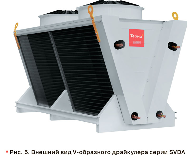В ассортименте драйкулеров «Терма» представлено более 30 моделей с количеством вентиляторов от 1 до 22. Для данного проекта, с учетом стесненных условий размещения, были предложены V-образные сухие градирни серии SVDA (рис. 5). Это мощные промышленные модели с высокой единичной производительностью. Оборудование способно обеспечить эффективный отвод тепла даже при высоких нагрузках, оставаясь при этом одним из самых компактных решений за счет специальной V-образной компоновки теплообменного блока.