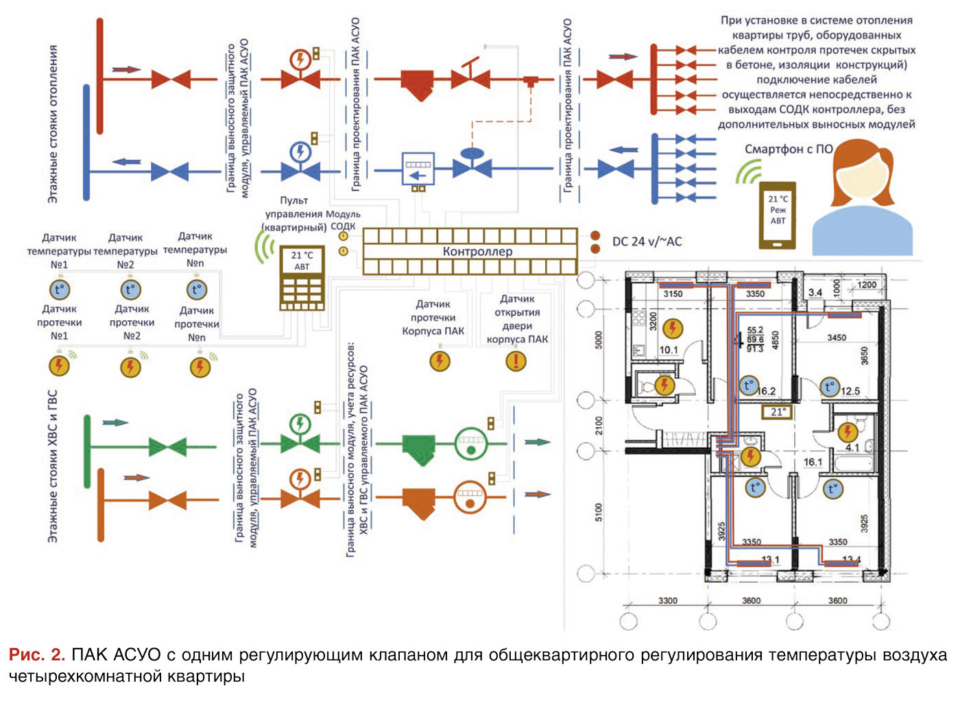Программно-аппаратный комплекс автоматической системы управления отоплением (ПАК АСУО) ООО «КРОНОС ГРУПП» является комплектным блоком автоматического управления квартирным отоплением, позволяющим осуществлять индивидуальное регулирование системы отопления: как централизованно всей квартиры (рис. 2), так и индивидуально для каждой комнаты одной квартиры (рис. 3).