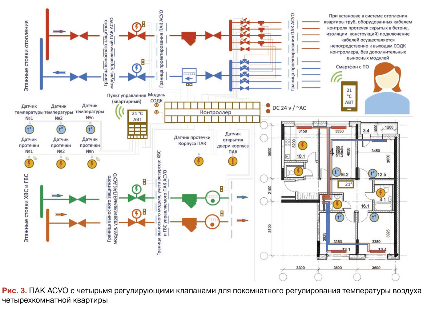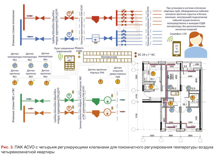 В целях защиты от протечек в аварийных ситуациях, таких как нарушение герметичности системы отопления, возникающее в том числе в результате течей скрытых в бетоне труб контуров системы отопления, течей в системах горячего и холодного водоснабжения или из-за случайно не закрытого крана холодной или горячей воды, функционалом контроллера ПАК АСУО предусмотрено выполнение защитных действий: автоматическое отключение подачи горячей, холодной воды и теплоносителя на отопление квартиры с уведомлением о произошедшей аварии на смартфон владельца квартиры.