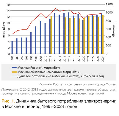 Рост потребления электроэнергии в быту города Москвы носит долговременный характер, хотя в последние годы он замедлился, несмотря на продолжающееся весьма быстрое увеличение численности постоянного населения и площади жилищного фонда. Так, если в период 1990–2000 годов темп ежегодного изменения электропотребления, по данным Росстата, составлял 5,34 %, то в 2001–2011 годах – 1,53 %, в 2001–2024 годах (с учетом элиминирования влияния прироста потребления электроэнергии за счет присоединения к Москве новых территорий в 2012 году) – всего лишь 0,9 %, а в 2014–2024 годах – минус 0,06 %, то есть в последнее десятилетие бытовое электропотребление вышло, по сути, на плато (рис. 1).