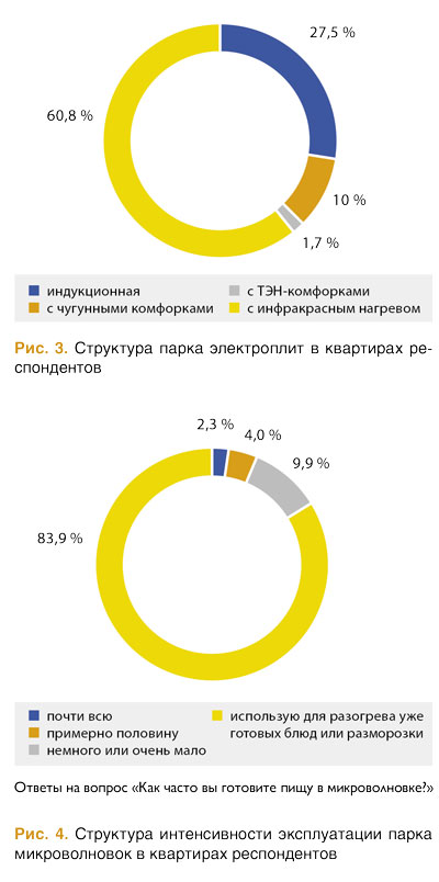 Из общего числа опрошенных 64 % респондентов имеют в своем домашнем хозяйстве СВЧ-печи (микроволновки). Причем в случае наличия электроплит в хозяйстве это более частое явление – 72 %, в случае газовых плит – всего 48 %. От общего числа имеющих в своем ДХ микроволновку 84 % указали, что используют ее только для разогрева готовых блюд или разморозки продуктов, и только 6 % – для приготовления всей еды или примерно ее половины (рис. 4). То есть она эксплуатируется достаточно интенсивно.