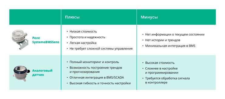Рассмотрим два решения, основанных на контроле дифференциального давления: применение дискретного реле с пороговым переключением или аналогового датчика с измерением точного значения перепада давления.
