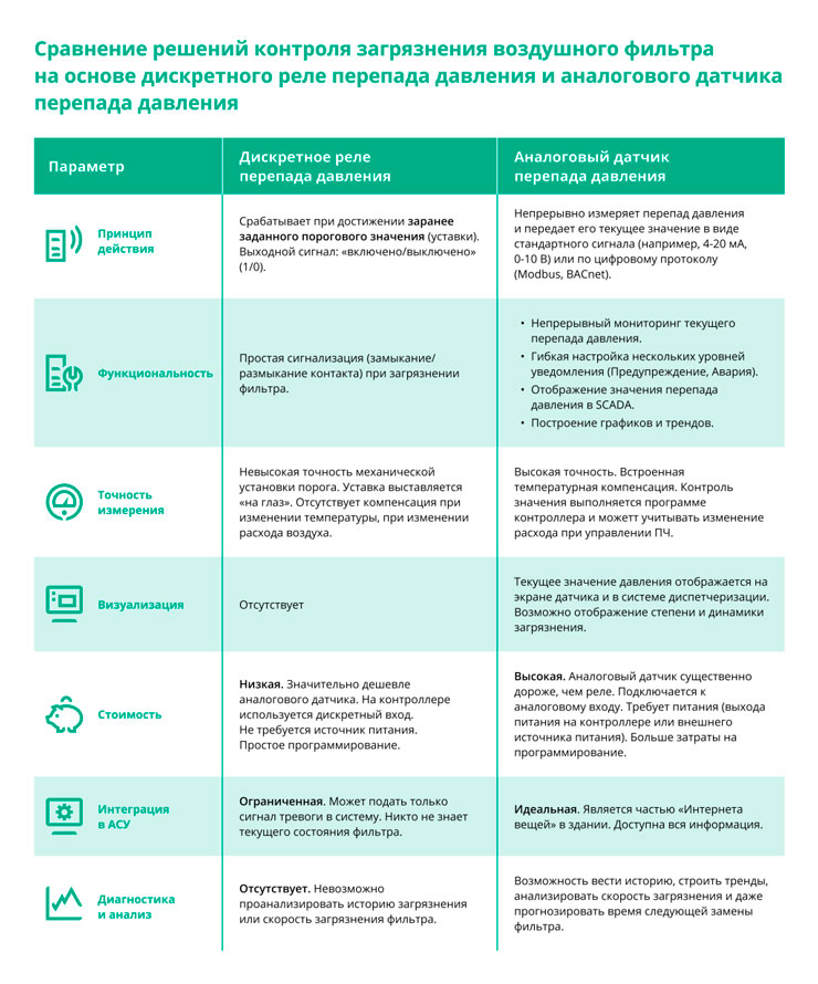 Дискретное реле перепада давления или аналоговый датчик перепада давления? Как выбрать? Подробное сравнение по параметрам и обзор плюсов и минусов решений.